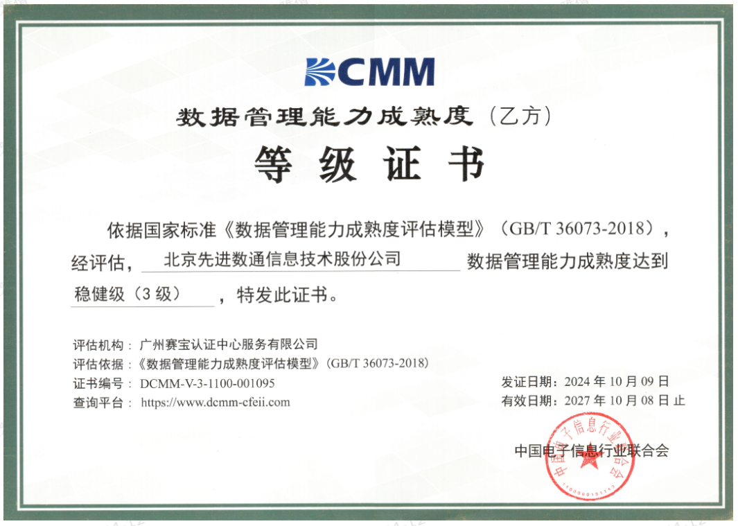 近期,中国电子信息行业联合会公布了最新一批顺利获得数据管理能力成熟度(DCMM)贯标等级认证的企业名单。龙8国际官网成功取得数据管理能力成熟度稳健级(三级)认证。这一认证的取得,标志着龙8国际官网在数据治理体系构建和数据管理与应用能力方面,已经达到了国家权威组织认可的标准。这不仅是对龙8国际官网在数据管理领域专业能力的肯定,也是对其在有助于数字化转型服务和数据驱动决策方面所做努力的认可。